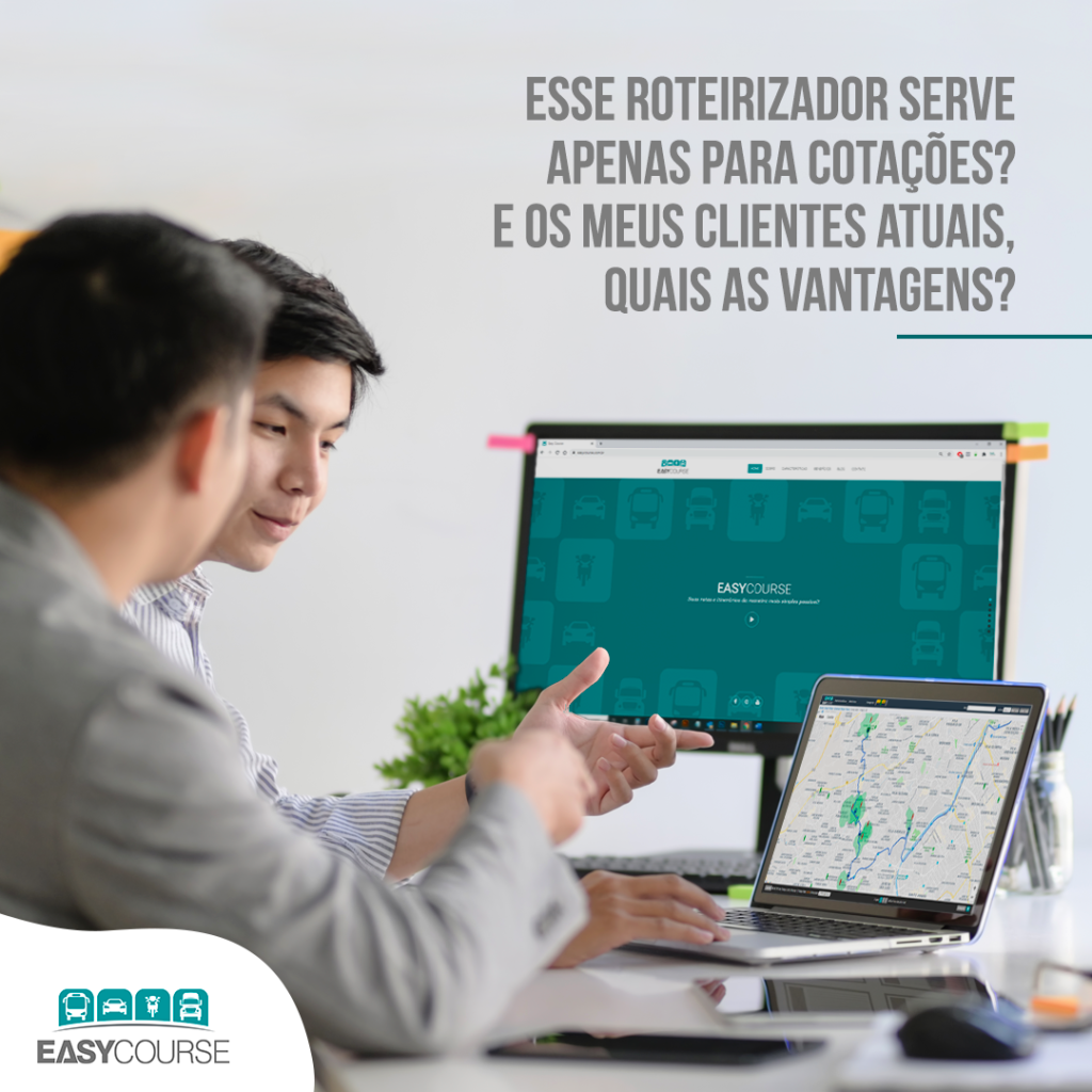 Temos hoje a mais completa solução de rotas e gestão de passageiros para transportadores e indústrias, tratando as variáveis de forma padronizada, economizando tempo, frota e recursos! Com o Easy Course, sua empresa poderá levar toda base de passageiros e rotas por cliente, emitir relatórios personalizados que auxiliam na tomada de decisões do dia a dia, com movimentos rápidos e precisos. Conheça o Easy Course agora mesmo e dê um passo à frente da concorrência!